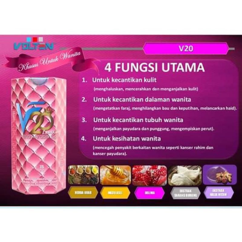 V20 Volten ialah produk minuman kesihatan yang diformulasikan khas untuk wanita, menggunakan ekstrak halia hitam sebagai bahan utama serta campuran herba lain seperti sarang burung, madu, dan delima. Berdasarkan testimoni dan ulasan, V20 terkenal dengan kelebihan untuk penjagaan dalaman dan luaran wanita.